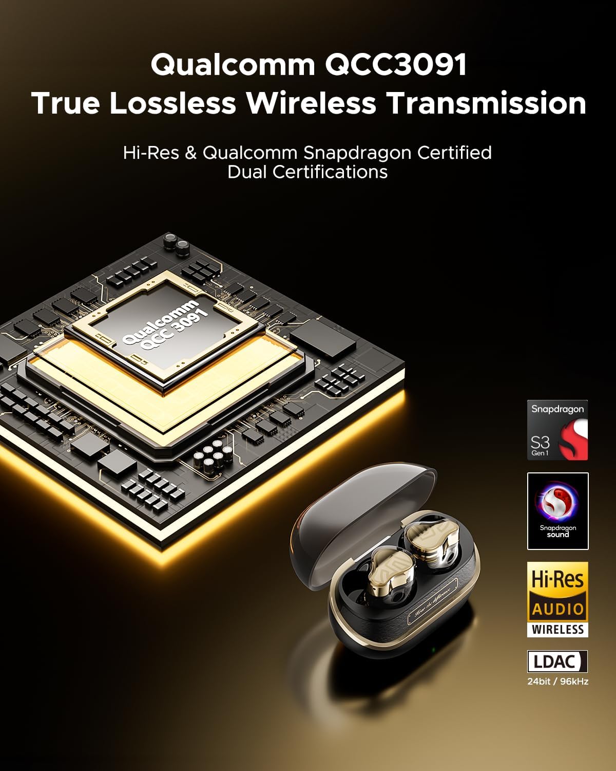 Features a hybrid dynamic/dual BA driver setup with Hi-Res certification. Supports LDAC, aptX Lossless, and Snapdragon Sound for high bitrates up to 1.2Mbps. Delivers sound quality comparable to wired Hi-Fi earbuds.